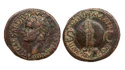 Asse con testa di Tiberio / Insegne, globo e timone