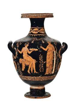 Hydria attica a figure rosse con eros nudo con stola e donna