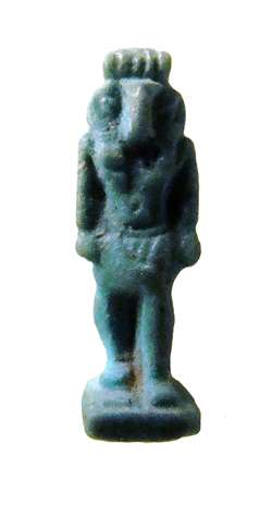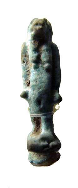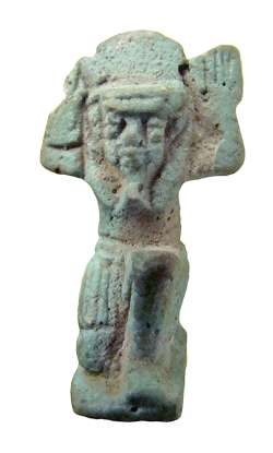 Amuleto in faience raffigurante Arpocrate con anello dietro la nuca, dall'Egitto