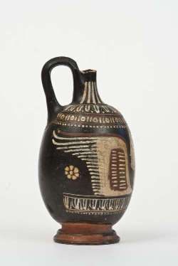 Lekythos ariballica a corpo globulare schiacciato a vernice nera sovraddipinta