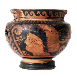 Coppa biansata apula a figure rosse. Lato A: testa femminile. Lato B: testa tipo gorgone