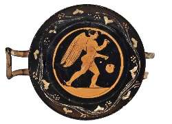 Kylix apula a figure rosse. Interno: Eros in corsa. Lato A: donna semisdraiata. Lato B: Eros in volo.