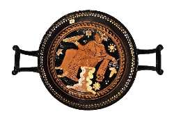 Kylix apula a figure rosse. Interno: Eros. Lato A e B: testa femminile.