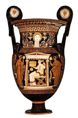 Cratere a volute con mascheroni con anse terminanti a teste di cigno attico a figure rosse. Lato A: offerta a defunta eroicizzata; Lato B: offerta alla tomba