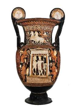 Catere a volute apulo a figure rosse. Lato A: offerta a cavaliere defunto eroicizzato; Lato B: offerta a edicola funeraria