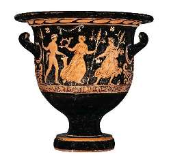 Cratere a campana apulo a figure rosse. Lato A: Dioniso, menade e satiro; Lato B: tre giovani ammantati