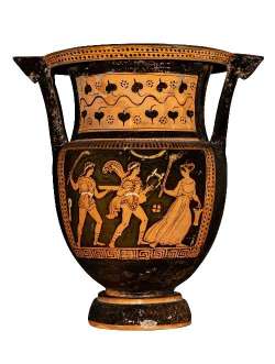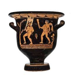 Cratere a campana apulo a figure rosse. Lato A: Dioniso e satiro; Lato B: due giovani ammantati