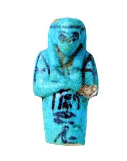 Frammento di usciabti in faience, appartenuto al padre divino Pa-nefer-..., del Terzo Periodo Intermedio, inv. 39258; Statuetta funeraria mummiforme, dall'Egitto