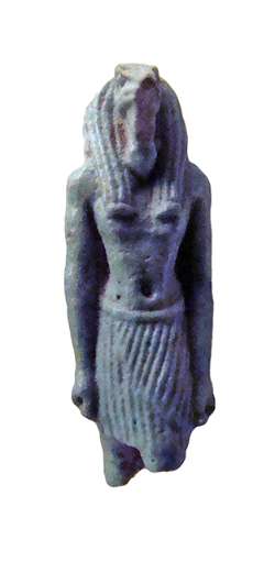 Amuleto in faience raffigurante Sekhmet con disco solare e uag, dall'Egitto