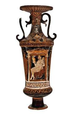 Anfora a candelabro apula a figure rosse. Lato A: defunto eroicizzato. Lato B: meandri e antefisse.