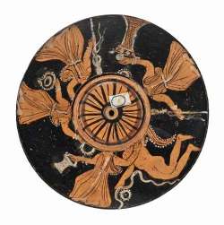 Coperchio di lekanis campana a figure rosse, con erote e quattro menadi, associato a 5387