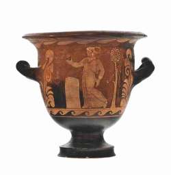 Cratere a campana campano a figure rosse Lato A: scena tetrale dionisiaca; Lato B: giovani ammantati