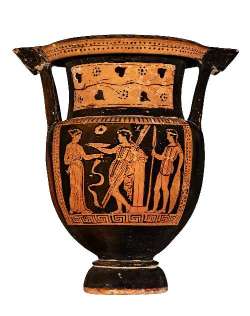 Cratere a colonnette apulo a figure rosse. Lato A: scena d'offerta; Lato B: tre giovani ammantati