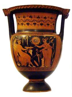 Cratere a colonnette apulo a figure rosse. Lato A: scena di offerta; Lato B: tre giovani ammantati.
