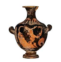 Hydria apula a figure rosse con giovane seduto e donna presso un pilastro