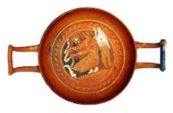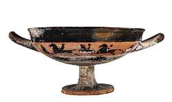 Kylix apula a figure rosse. Interno: Eros su cigno. Lato A: Eros seduto con offerte. Lato B: donna in corsa.