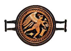 Kylix apula a figure rosse. Interno: Eros in corsa. Lato A: donna semisdraiata. Lato B: Eros in volo.