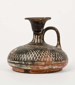 Lekythos ariballica a corpo globulare schiacciato a vernice nera sovraddipinta
