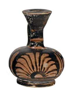 Lekythos attica a figure nere con motivo a raggiera e boccioli di loto