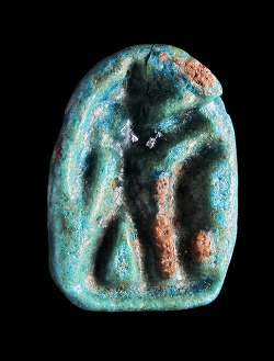 Scaraboide in faience con divinità, disco solare e piuma, dall'Egitto