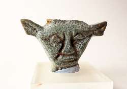 Parte superiore del manico di un sistro in faience con il volto della dea Hathor, dall'Egitto