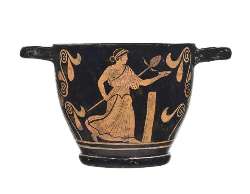 Skyphos lucano a figure rosse. Lato A: menade; Lato B: atleta