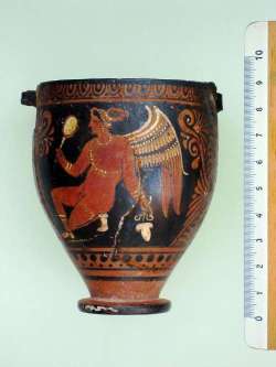 Skyphos campano a figure rosse. Lato A: erote alato, rivolto a sinistra. Lato B: giovane ammantato di profilo