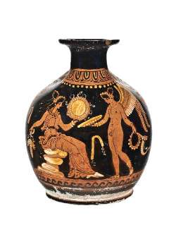 Askos attico a figure rosse. Lato A: sfinge. Lato B: cerva
