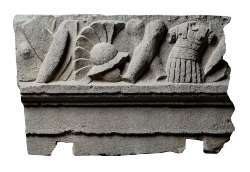 Fregio con rilievo d'armi frammento in calcare da Trieste via Ciamician