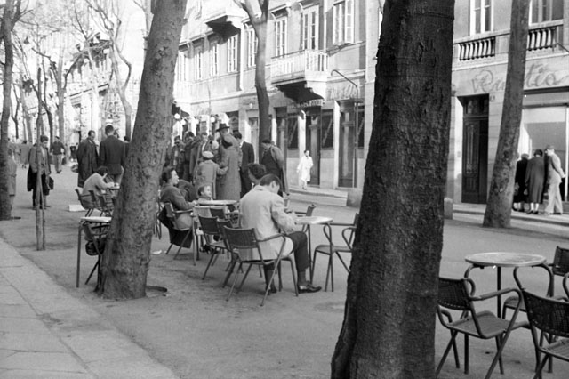 Viale XX Settembre: gente ai tavoli e albero dei bechi o de Rossetti