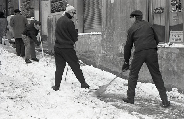 Neve : Venderigole di Ponterosso con ragazzi che giocano e spazzaneve in piazza della Borsa
