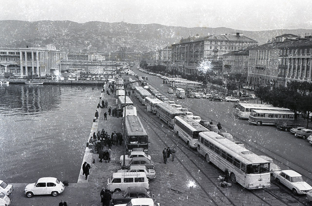 Pullman di acquirenti jugoslavi sulle rive e vicino alla Pescheria (vedute dall'alto)