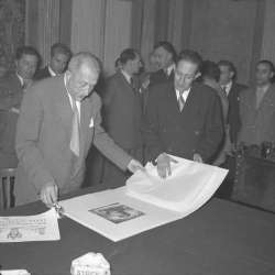 Orchestra della Scala : V. de Sabata : arrivo, ricevimento municipio, concerto