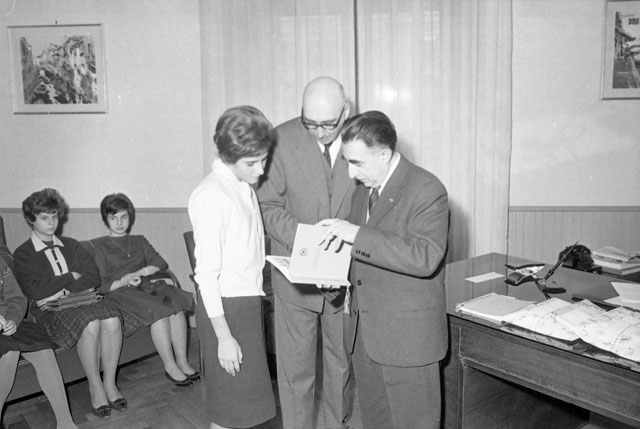 Consegna bandiere di combattenti ai caccia Indomito e Impetuoso (ministro Taviani)