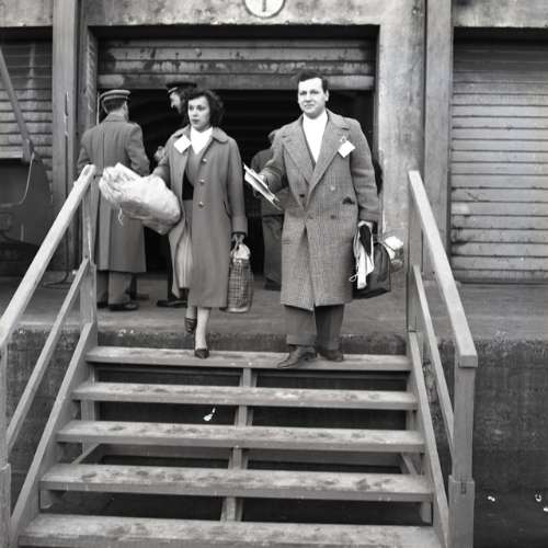 Australia: partenza emigranti con motonave Toscana, statua di S. Giusto e mons. Santin
