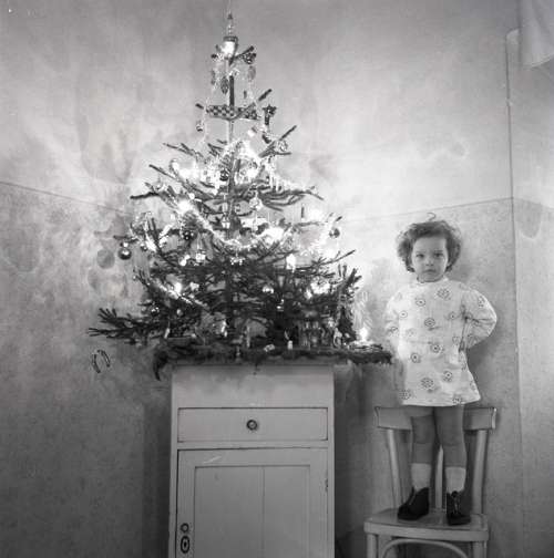 Natale in famiglia : ritratto di bambina accanto all'albero di Natale