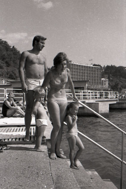 Anni 1960/'70 Interni ed esterni piccola cappella ; bagnanti Grignano (coppia + 2 figli)