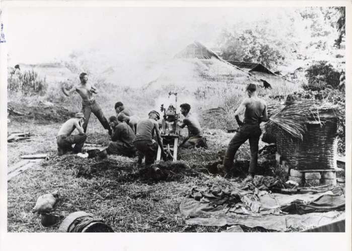 Lavoratori indiani rastrellano il greto di un torrente situato nel nord della Birmania per costruire la strada di Ledo