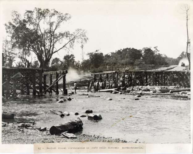 Truppe Americane e Cinesi su un ponte di barche improvvisato attraversano il fiume Mogaung