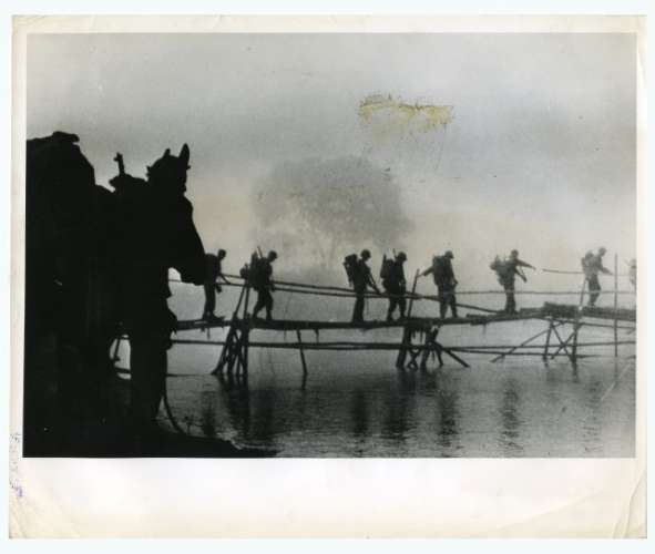 U.S. soldiers in Burma action cross a bamboo footbridge