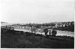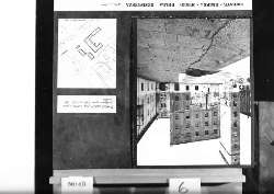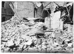 In primo piano macerie del forno crematorio, sullo sfondo un altro edificio rimasto danneggiato dallo scoppio