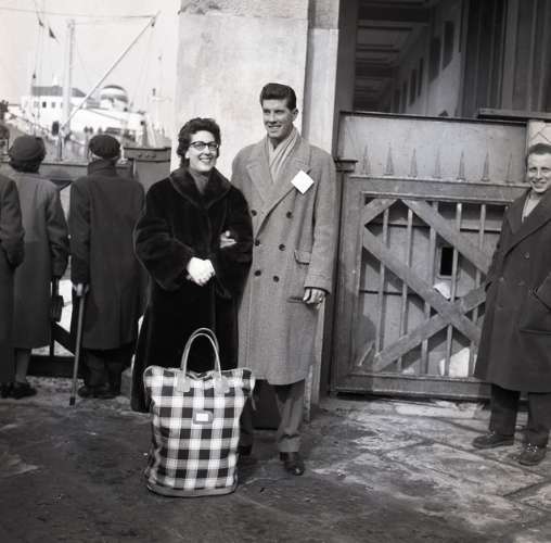 Australia: partenza emigranti con motonave Toscana, statua di S. Giusto e mons. Santin