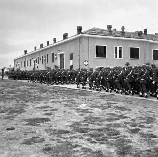 Paracadutisti, Piazza Unità, militari, esercito. Staffieri sindaco, Cannarozzo prefetto, architetti Celli.