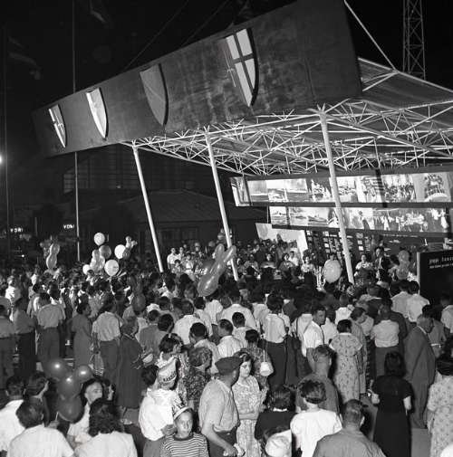Fiera di Trieste, 1952. Esterni fiera, folla di visitatori, stand