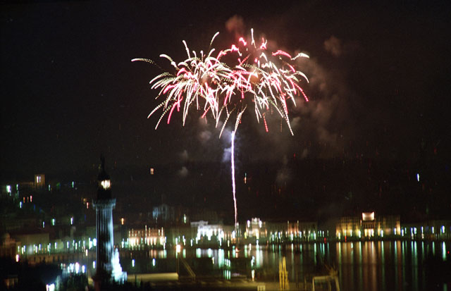 Fuochi d'artificio, rive di Trieste, stazione marittima, Faro della Vittoria, panoramiche Trieste.