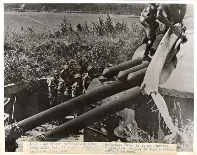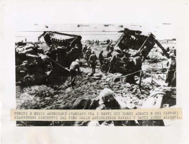 Uomini e mezzi americani avanzano fra i resti dei carri armati e dei cannoni giapponesi distrutti dal tiro delle artiglierie navali e dagli aerei alleati