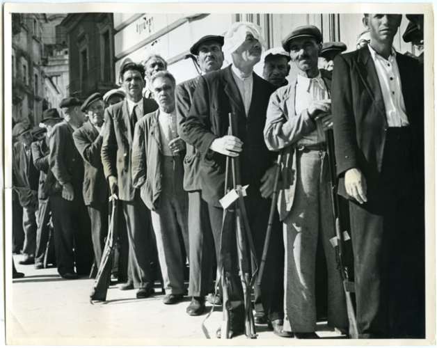 SICILIANS SURRENDER WEAPONS-NATIVES OF COMIS0, SICILY, LINE UP TO SURRENDER THEIR RIFLES AND OTHER WEAPONS AFTER AMERICAN TROOPS HARE TAKEN THE TOWN