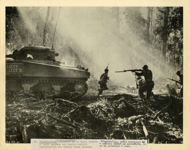 Bougainville : riparati da un carro armato i fanti sparano sui nemici isolati infiltratisi col favore delle tenebre