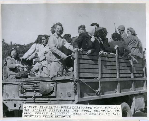 QUESTE FRAULEINS DELLA LUFTWAFFE, CATTURATE DAGLI ALLEATI NELL'ITALIA DEL NORD, SEMBRANO FELICI, MENTRE AUTOMEZZI DELLA 5 ARMATA LE TRASPORTANO NELLE RETROVIE.