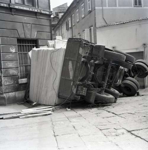 Incidente camion contro un albero. Viale Miramare, code traffico. Vigili del fuoco. Mezzi Pertot, piazza Unità. Conferenza e relatore. Camionisti poveri turchi, Riva Traiana, HP. Trasporti.